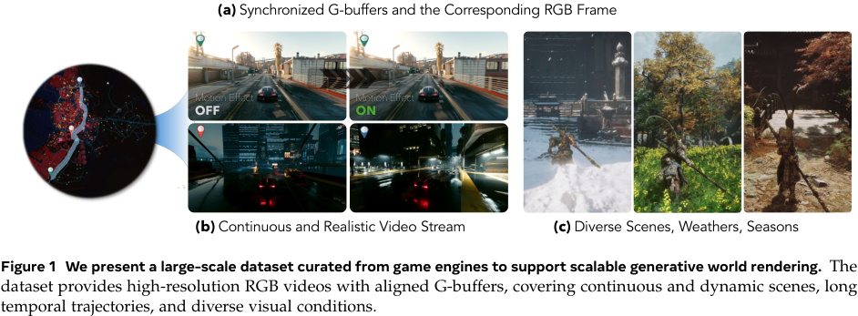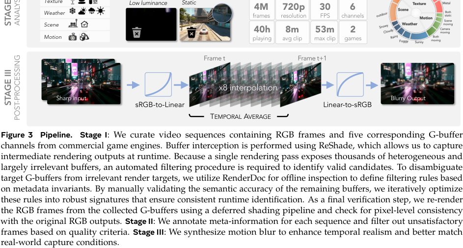 - Данные: 4 миллиона непрерывных кадров (720p, 30 FPS), вырезанных из AAA-игр с помощью метода сшивки двух экранов. Это не скриншоты, а синхронизированные потоки: RGB-изображение + пять каналов G-буфера (глубина, нормали, альбедо и т.д.).
